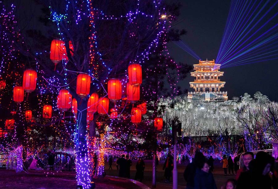 La gente visita el festival de linternas en el parque Nanhu de Tangshan, provincia de Hebei del norte de China, 15 de febrero de 2019. El Festival de las Linternas se celebra el 19 de febrero este a?o. [Foto / Xinhua]