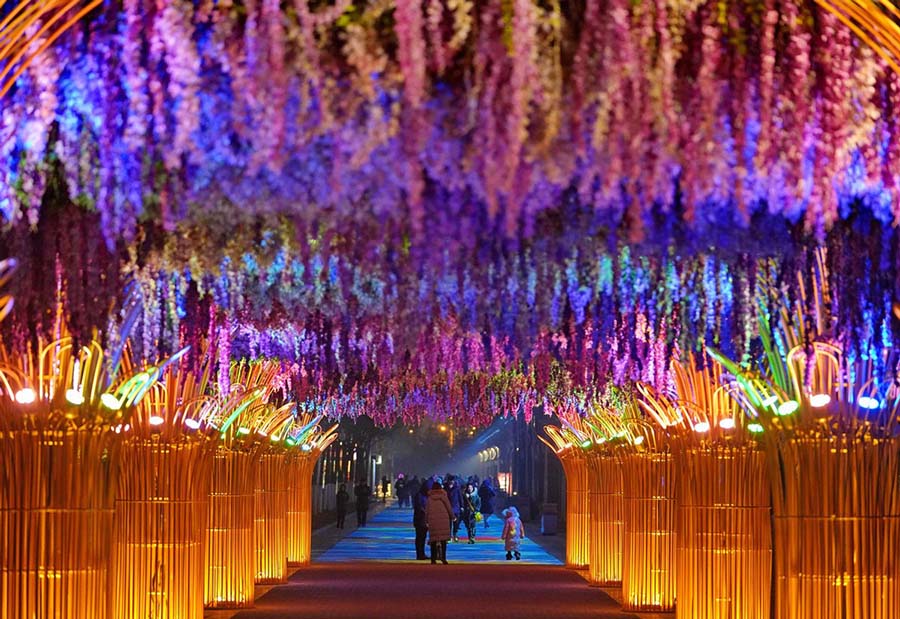 La gente visita el festival de linternas en el parque Nanhu de Tangshan, provincia de Hebei del norte de China, 15 de febrero de 2019. El Festival de las Linternas se celebra el 19 de febrero este a?o. [Foto / Xinhua]