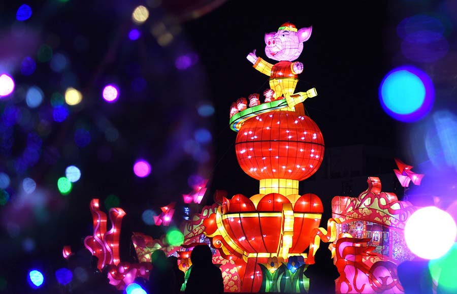 La gente contempla las linternas en una plaza en el condado Yiyuan de Zibo, provincia de Shandong, este de China, el 15 de febrero de 2019. El Festival de las Linternas se celebra el 19 de febrero este a?o. [Foto / Xinhua]