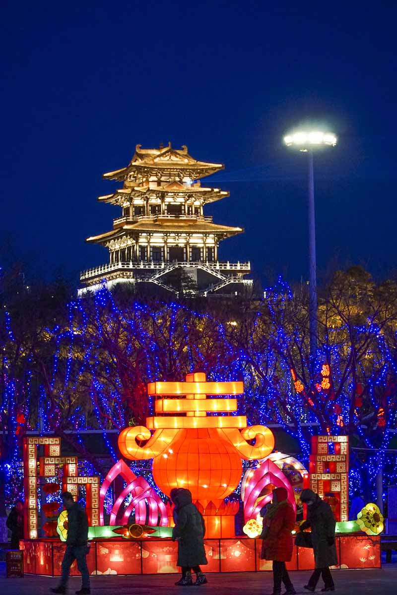Los turistas observan las linternas en el parque Nanhu de Tangshan, provincia de Hebei del norte de China, 15 de febrero de 2019. El Festival de las Linternas se celebra el 19 de febrero este a?o. [Foto / Xinhua]