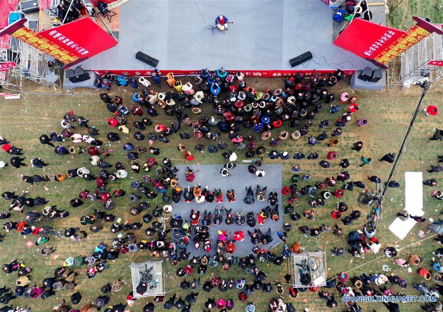 HENAN, febrero 17, 2019 (Xinhua) -- Vista aérea de personas asistiendo a la Feria Quyi en la villa de Majie del condado de Baofeng, en la provincia de Henan, en el centro de China, el 17 de febrero de 2019. Cada a?o después del Festival de Primavera, la villa de Majie, de la provincia de Henan, en el centro de China, es visitada por artistas tradicionales de todo el país. Desde hace 700 a?os se realiza la feria del arte tradicional en Majie. El arte tradicional chino, o Quyi, tiene muchas formas, incluyendo canto de balada, narración de historias y diálogo cómico. En 2006, la feria Majie Quyi fue inscrita en la primera lista de patrimonio cultural intangible nacional. (Xinhua/Li Jianan)