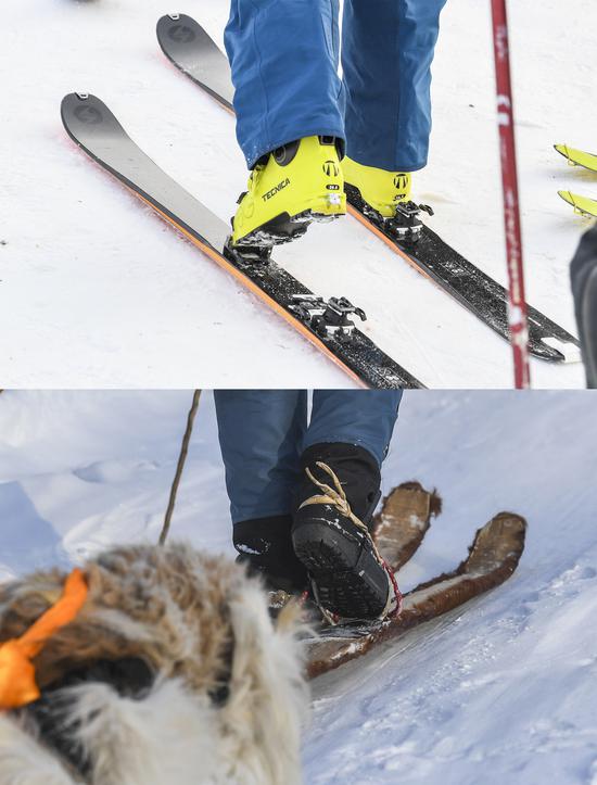 Esquís modernos (arriba) y esquís tradicionales (abajo). (Xinhua / Hu Huhu)