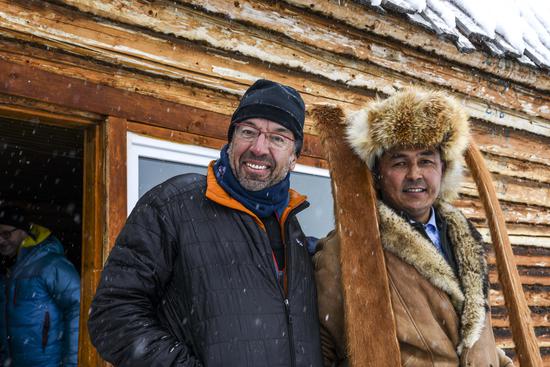 Bruno (izquierda) y Mirbek (derecha) sosteniendo un par de antiguos esquís de piel. (Xinhua / Hu Huhu)