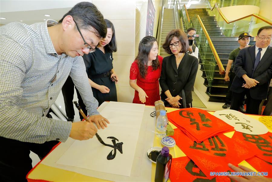 PHNOM PENH, febrero 18, 2019 (Xinhua) -- La princesa de Camboya, Norodom Buppha Devi (c-d), visita una estand que exhibe caligrafía china durante la exposición "Percibiendo la Semana de la Cultura China-Jiangsu" en Phonm Penh, Camboya, el 18 de febrero de 2019. La exposición "Percibiendo la Semana de la Cultura China-Jiangsu" comenzó el lunes en Phonm Penh, con el objetivo de fortalecer los intercambios culturales y mejorar la amistad entre China y Camboya. (Xinhua/Phearum)