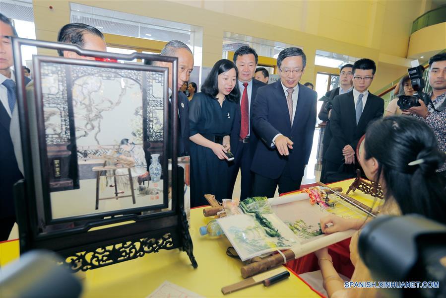 PHNOM PENH, febrero 18, 2019 (Xinhua) -- El embajador chino en Camboya, Wang Wentian (c-d), visita un estand que exhibe bordado fino de Wuxi durante la exposición "Percibiendo la Semana de la Cultura China-Jiangsu" en Phonm Penh, Camboya, el 18 de febrero de 2019. La exposición "Percibiendo la Semana de la Cultura China-Jiangsu" comenzó el lunes en Phonm Penh, con el objetivo de fortalecer los intercambios culturales y mejorar la amistad entre China y Camboya. (Xinhua/Phearum)