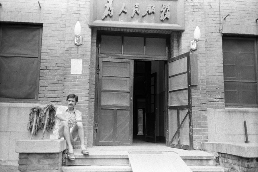 Rovetta sienta a la puerta del edificio de dormitorio en Tsinghua en 1979.