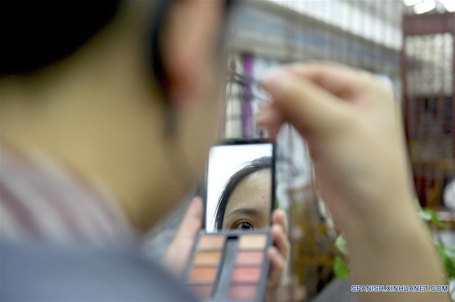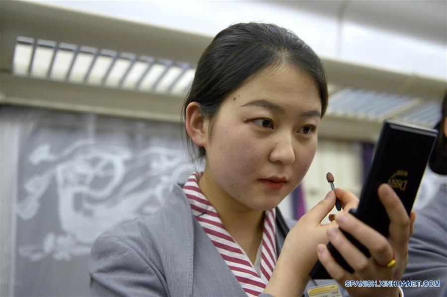 GANSU, febrero 19, 2019 (Xinhua) -- Imagen del 18 de febrero de 2019 de una asistente de viaje de ferrocarril maquillándose previo a interpretar un baile a bordo del tren Y667 que corre de Lanzhou a Dunhuang, en la provincia de Gansu, en el noroeste de China. Las asistentes de viaje a bordo del tren Y667 realizaron un espectáculo de baile tradicional para los pasajeros durante su viaje de Lanzhou a Dunhuang. Dunhuang es una parada importante en la antigua Ruta de la Seda por las cercanas Grutas de Mogao. (Xinhua/Li Jie)