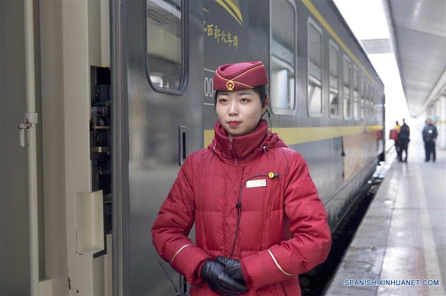GANSU, febrero 19, 2019 (Xinhua) -- Imagen del 18 de febrero de 2019 de una asistente de viaje de ferrocarril esperando para atender a los pasajeros a bordo del tren Y667 que corre de Lanzhou a Dunhuang, en la provincia de Gansu, en el noroeste de China. Las asistentes de viaje a bordo del tren Y667 realizaron un espectáculo de baile tradicional para los pasajeros durante su viaje de Lanzhou a Dunhuang. Dunhuang es una parada importante en la antigua Ruta de la Seda por las cercanas Grutas de Mogao. (Xinhua/Li Jie)