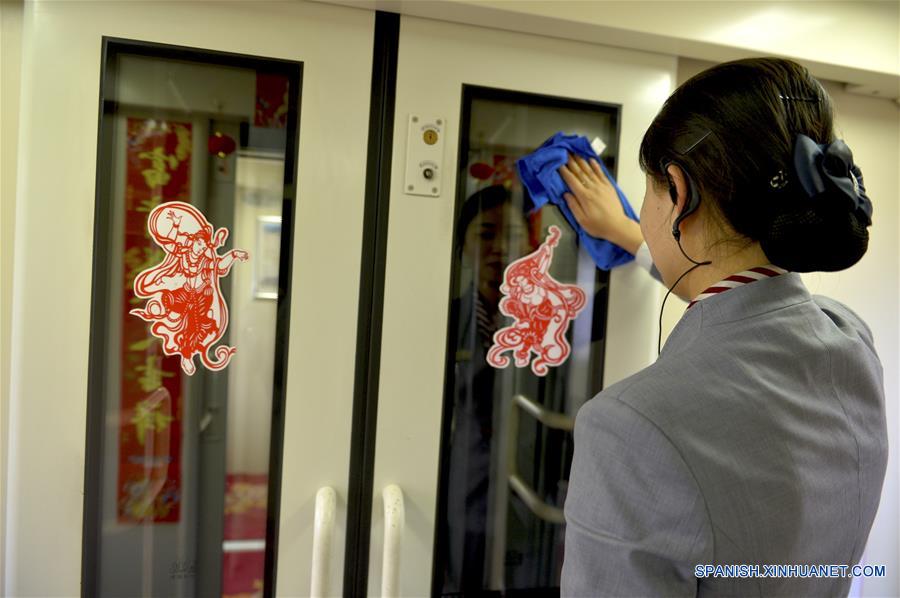GANSU, febrero 19, 2019 (Xinhua) -- Imagen del 18 de febrero de 2019 de una asistente de viaje de ferrocarril limpiendo una puerta a bordo del tren Y667 que corre de Lanzhou a Dunhuang, en la provincia de Gansu, en el noroeste de China. Las asistentes de viaje a bordo del tren Y667 realizaron un espectáculo de baile tradicional para los pasajeros durante su viaje de Lanzhou a Dunhuang. Dunhuang es una parada importante en la antigua Ruta de la Seda por las cercanas Grutas de Mogao. (Xinhua/Li Xiao)