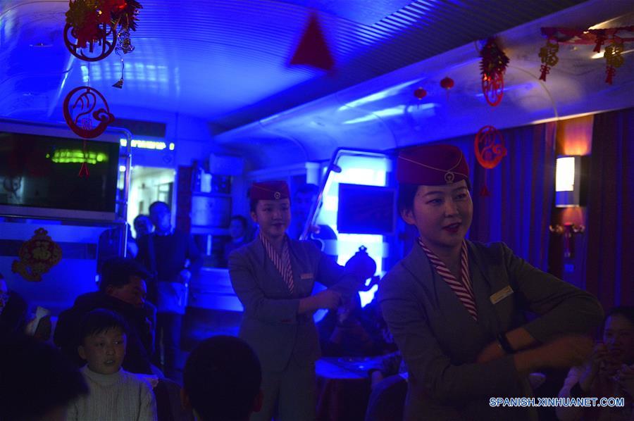 GANSU, febrero 19, 2019 (Xinhua) -- Imagen del 18 de febrero de 2019 de asistentes de viaje de ferrocarril interpretando un baile a bordo del tren Y667 que corre de Lanzhou a Dunhuang, en la provincia de Gansu, en el noroeste de China. Las asistentes de viaje a bordo del tren Y667 realizaron un espectáculo de baile tradicional para los pasajeros durante su viaje de Lanzhou a Dunhuang. Dunhuang es una parada importante en la antigua Ruta de la Seda por las cercanas Grutas de Mogao. (Xinhua/Li Jie)