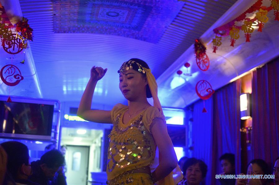 GANSU, febrero 19, 2019 (Xinhua) -- Imagen del 18 de febrero de 2019 de una asistente de viaje de ferrocarril interpretando un baile a bordo del tren Y667 que corre de Lanzhou a Dunhuang, en la provincia de Gansu, en el noroeste de China. Las asistentes de viaje a bordo del tren Y667 realizaron un espectáculo de baile tradicional para los pasajeros durante su viaje de Lanzhou a Dunhuang. Dunhuang es una parada importante en la antigua Ruta de la Seda por las cercanas Grutas de Mogao. (Xinhua/Li Xiao)