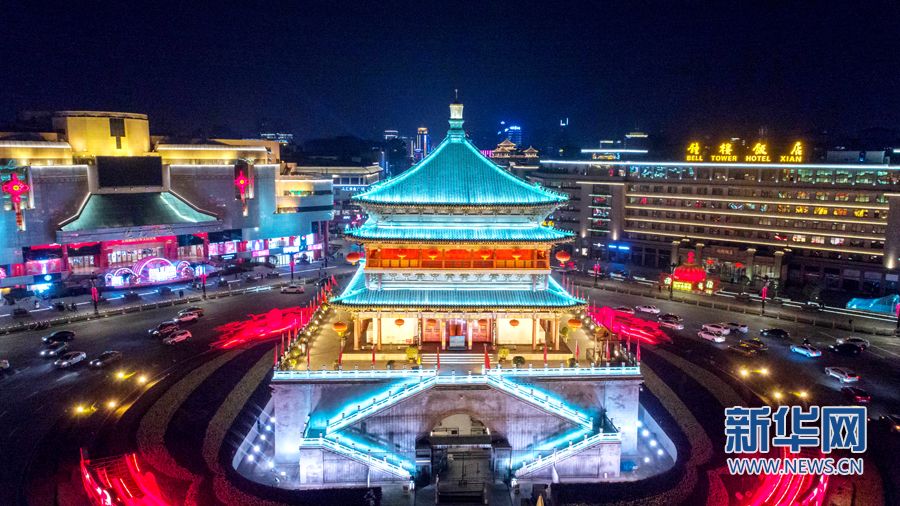 Vista aérea de la Torre de la Campana, edificios y calles en la noche en la ciudad de Xi'an, provincia de Shaanxi, noroeste de China. [Foto / Xinhua]