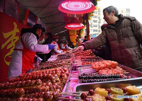 La gente compra “tangqiu”, o "tanghulu", un dulce chino tradicional de frutas confitadas, en una feria anual de tanghulu en Qingdao, provincia de Shandong, este de China, el 18 de febrero de 2019. (Xinhua / Li Ziheng)