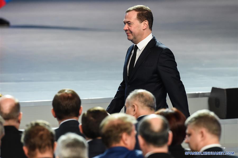 El primer ministro de Rusia, Dmitry Medvedev, llega previo a que el presidente de Rusia, Vladimir Putin, pronuncie su discurso anual ante la Asamblea Federal en Moscú, Rusia, el 20 de febrero de 2019. Los resultados preliminares de la implementación de los proyectos nacionales de Rusia deben ser concretados en 2020, dijo el miércoles el presidente ruso, Vladimir Putin. (Xinhua/Evgeny Sinitsyn)