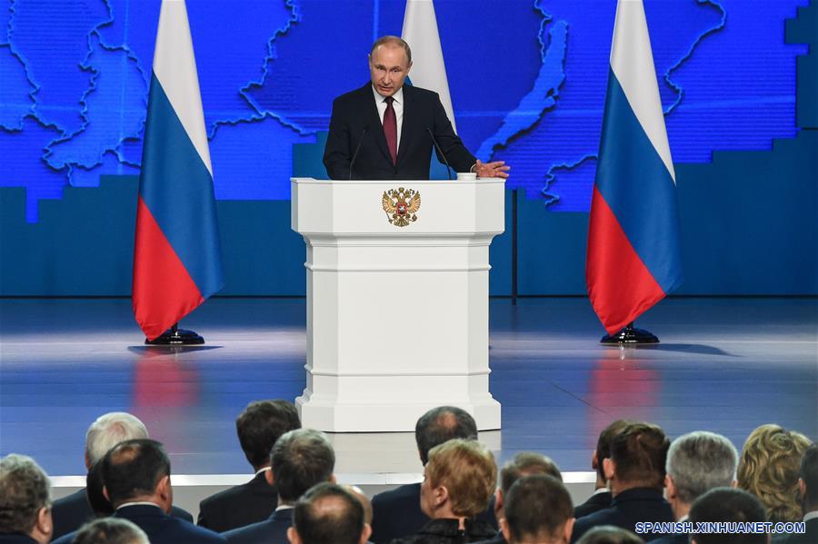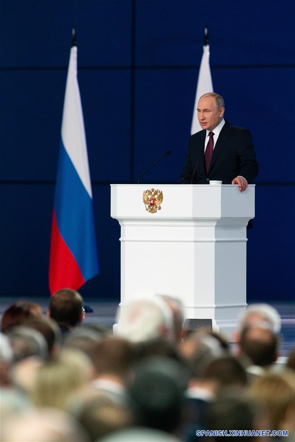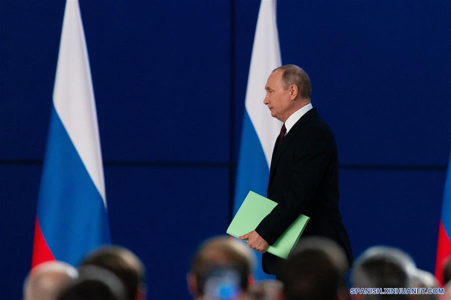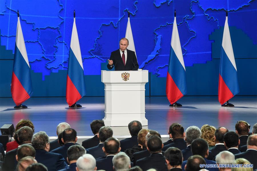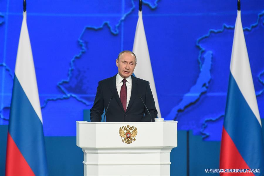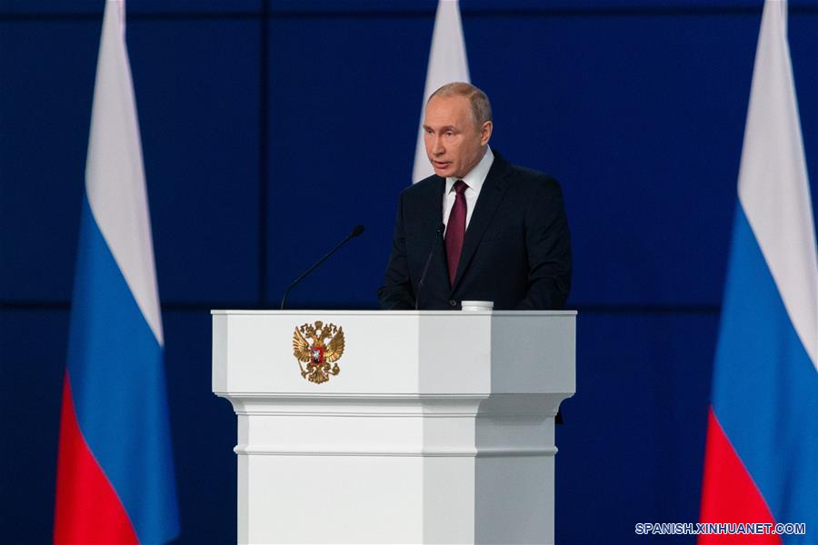 El presidente de Rusia, Vladimir Putin, pronuncia su discurso anual ante la Asamblea Federal en Moscú, Rusia, el 20 de febrero de 2019. Los resultados preliminares de la implementación de los proyectos nacionales de Rusia deben ser concretados en 2020, dijo el miércoles el presidente ruso, Vladimir Putin. (Xinhua/Evgeny Sinitsyn)
