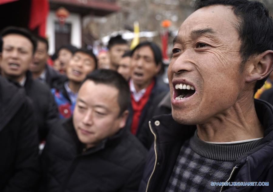 GANSU, febrero 20, 2019 (Xinhua) -- Imagen del 19 de febrero de 2019 de residentes entonando canciones populares mientras observan los espectáculos "Shehuo" llevados a cabo para celebrar el Festival de los Faroles, en la villa de Sibei del municipio de Majie en el distrito de Wudu, provincia de Gansu, en el noroeste de China. La temporada de la Fiesta de Primavera de China 2019 llegó a su fin cuando las actividades fueron llevadas a cabo el martes para celebrar el Festival de los Faroles. En muchas áreas rurales a través de China, desfiles folclóricos y banquetes conocidos colectivamente como "Shehuo" se realizan para llevar el ambiente festivo al clímax. (Xinhua/Cai Yang)