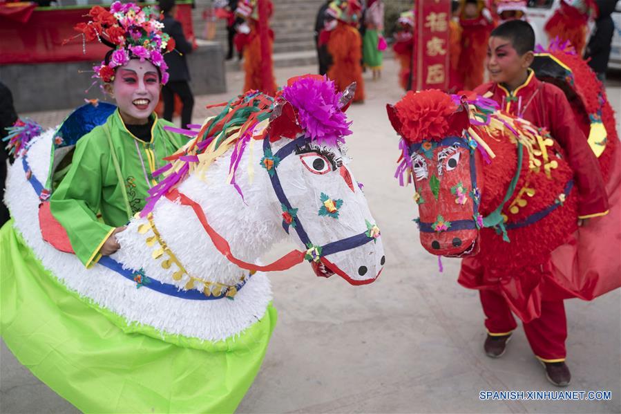 GANSU, febrero 20, 2019 (Xinhua) -- Imagen del 19 de febrero de 2019 de artistas populares participando en los espectáculos "Shehuo" llevados a cabo para celebrar el Festival de los Faroles, en la villa de Sibei del municipio de Majie en el distrito de Wudu, provincia de Gansu, en el noroeste de China. La temporada de la Fiesta de Primavera de China 2019 llegó a su fin cuando las actividades fueron llevadas a cabo el martes para celebrar el Festival de los Faroles. En muchas áreas rurales a través de China, desfiles folclóricos y banquetes conocidos colectivamente como "Shehuo" se realizan para llevar el ambiente festivo al clímax. (Xinhua/Cai Yang)
