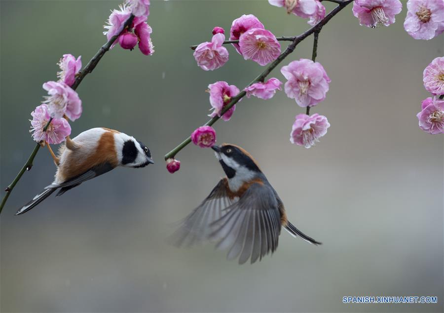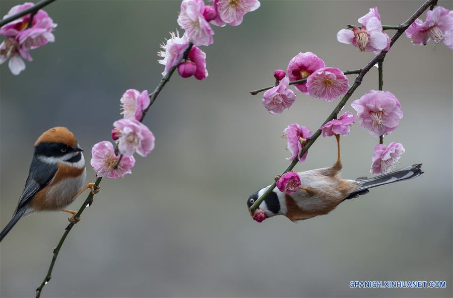 JIANGSU, febrero 21, 2019 (Xinhua) -- Pájaros se reúnen en torno a las flores de ciruelo en un jardín de ciruelos, en Wuxi, provincia de Jiangsu, en el este de China, el 21 de febrero de 2019. (Xinhua/Pan Zhengguang)