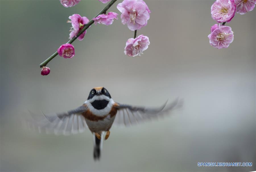 JIANGSU, febrero 21, 2019 (Xinhua) -- Un pájaro vuela en torno a las flores de ciruelo en un jardín de ciruelos, en Wuxi, provincia de Jiangsu, en el este de China, el 21 de febrero de 2019. (Xinhua/Pan Zhengguang)