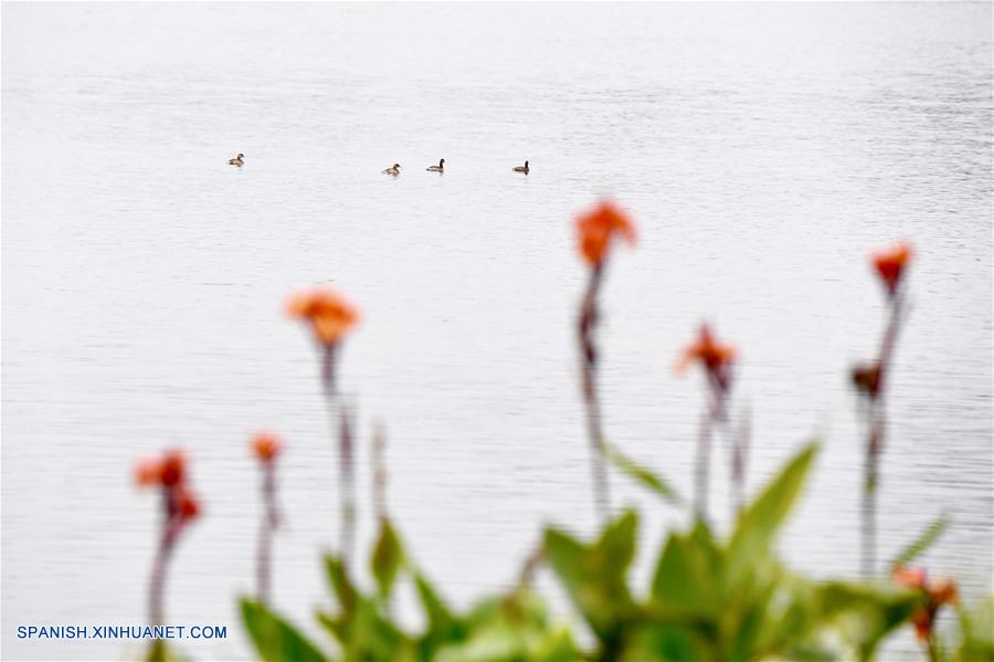 FUJIAN, febrero 22, 2019 (Xinhua) -- Aves acuáticas cruzan un lago en el parque ecológico de Bihu en Zhangzhou, provincia de Fujian, en el sureste de China. (Xinhua/Jiang Kehong)