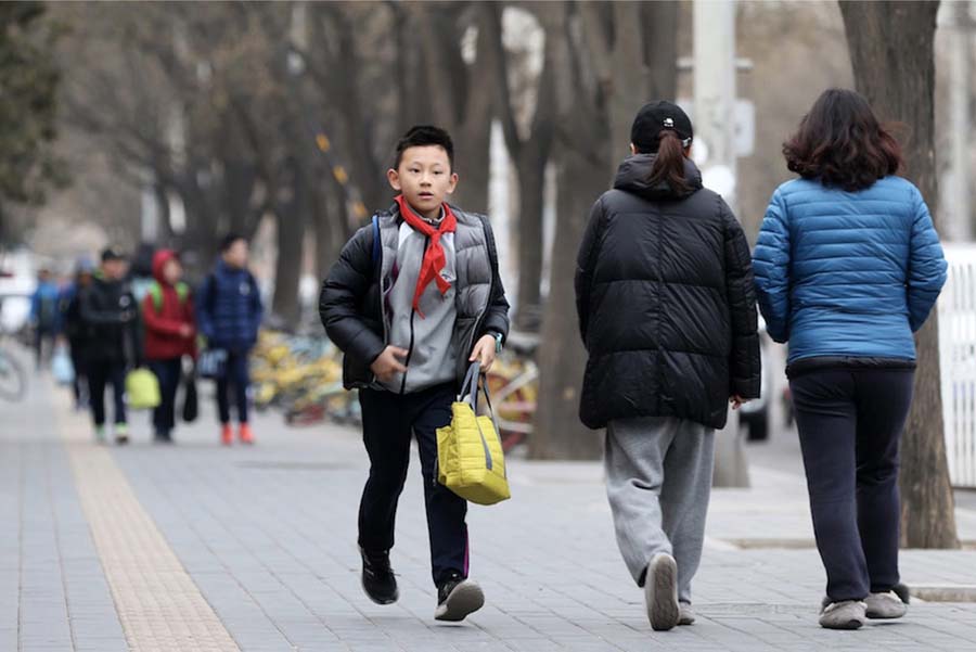 Un estudiante se apresura por llegar a la Escuela Primaria Experimental Huajadi en Beijing el 25 de febrero de 2019. [Foto por Wang Zhuangfei / chinadaily.com.cn]