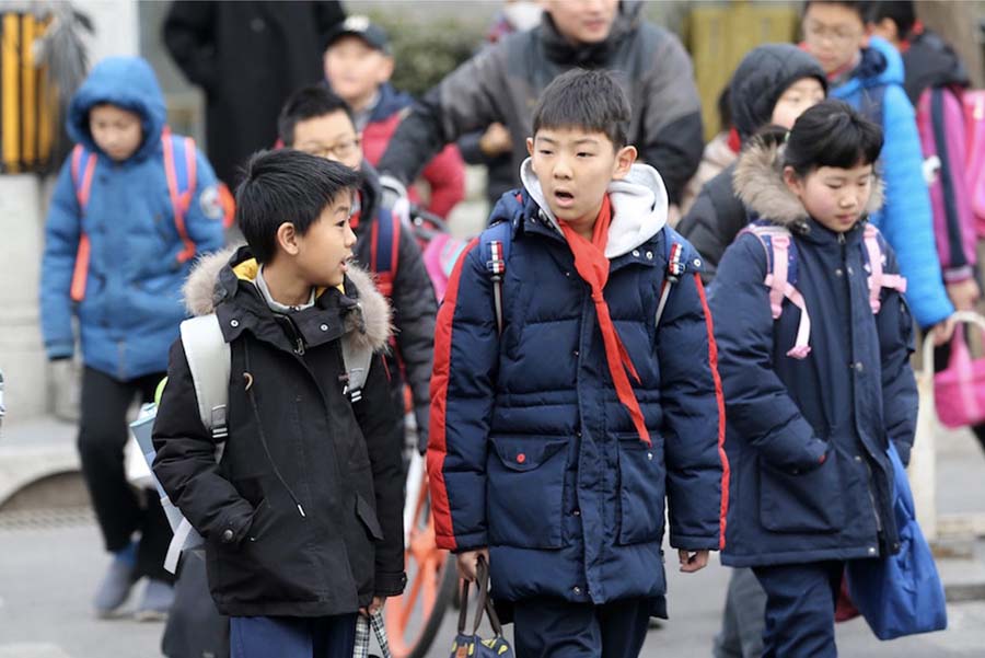 Beijing, 26/02/2019(El Pueblo en Línea) - Los estudiantes llegan a la Escuela Primaria Experimental Huajadi en Beijing el 25 de febrero de 2019. Ese mismo día, comenzó el nuevo semestre en las escuelas primarias y secundarias de Beijing. [Foto por Wang Zhuangfei / chinadaily.com.cn]