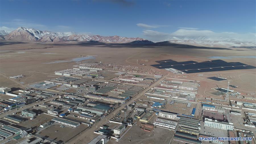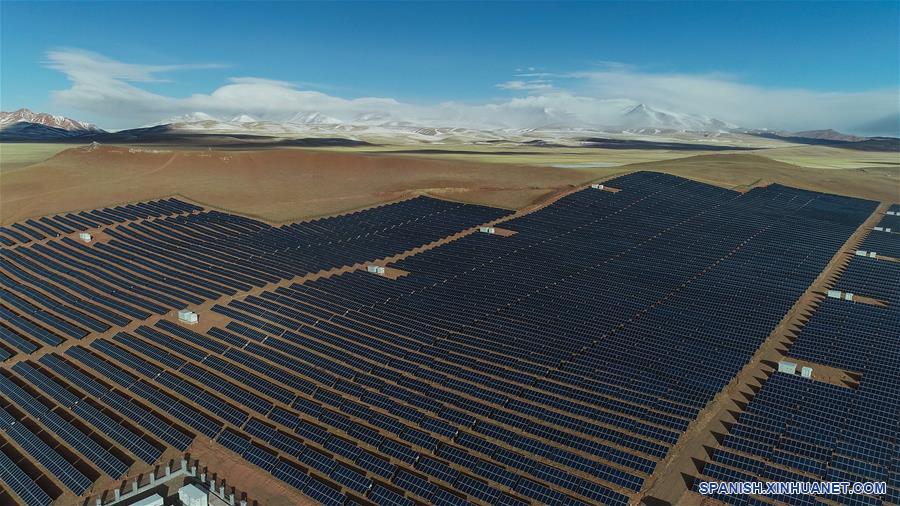 SHUANGHU, febrero 27, 2019 (Xinhua) -- Imagen del 31 de enero de 2019 de una vista aérea de una planta de energía fotovoltaica, en el condado de Shuanghu, en la Región Autónoma del Tíbet, en el suroeste de China. El condado de Shuanghu, localizado a 5,000 metros sobre el nivel del mar en la Región Autónoma del Tíbet, en el suroeste de China, sufre de fuertes vientos 200 días al a?o. Con una temperatura media durante el a?o de menos cinco grados centígrados, Shuanghu es el hogar del tercer glaciar más grande del mundo, Purog Kangri. Ocasionalmente, la temperatura aquí cae a menos 40 grados centígrados. El condado, con un área de aproximadamente 120,000 kilómetros cuadrados, se encuentra en el medio de la Reserva Natural Nacional Qiangtang. Hay 135 empleados de conservación trabajando en las 15 estaciones de manejo y conservación de vida silvestre de Shuanghu para mejorar la protección de los animales salvajes. En 2018, el gobierno del condado suspendió la construcción de servicios de apoyo relacionados con el turismo alrededor del glaciar Purog Kangri para proteger mejor el medio ambiente. Shuanghu ahora tiene aproximadamente 20,000 yaks salvajes y 200,000 antílopes tibetanos, además de más de 20 especies raras como el leopardo de las nieves y el oso pardo. (Xinhua/Purbu Zhaxi)