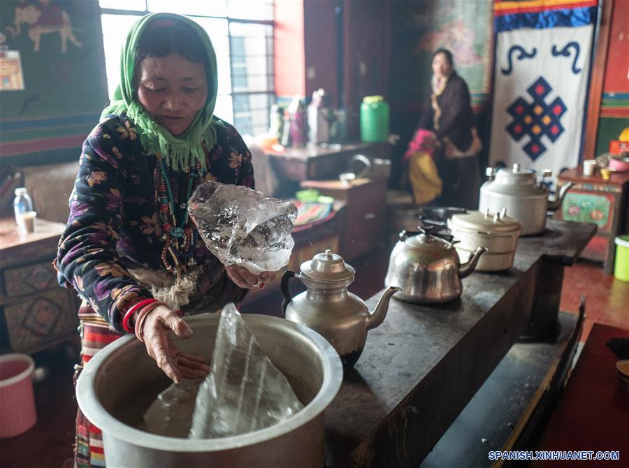 SHUANGHU, febrero 27, 2019 (Xinhua) -- Imagen del 31 de enero de 2019 de una pastora derritiendo hielo antes de hervir agua, en el municipio de Garco del condado de Shuanghu, en la Región Autónoma del Tíbet, en el suroeste de China. El condado de Shuanghu, localizado a 5,000 metros sobre el nivel del mar en la Región Autónoma del Tíbet, en el suroeste de China, sufre de fuertes vientos 200 días al a?o. Con una temperatura media durante el a?o de menos cinco grados centígrados, Shuanghu es el hogar del tercer glaciar más grande del mundo, Purog Kangri. Ocasionalmente, la temperatura aquí cae a menos 40 grados centígrados. El condado, con un área de aproximadamente 120,000 kilómetros cuadrados, se encuentra en el medio de la Reserva Natural Nacional Qiangtang. Hay 135 empleados de conservación trabajando en las 15 estaciones de manejo y conservación de vida silvestre de Shuanghu para mejorar la protección de los animales salvajes. En 2018, el gobierno del condado suspendió la construcción de servicios de apoyo relacionados con el turismo alrededor del glaciar Purog Kangri para proteger mejor el medio ambiente. Shuanghu ahora tiene aproximadamente 20,000 yaks salvajes y 200,000 antílopes tibetanos, además de más de 20 especies raras como el leopardo de las nieves y el oso pardo. (Xinhua/Purbu Zhaxi)