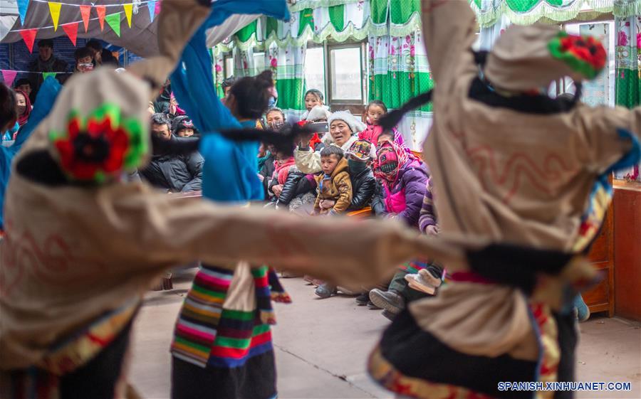 SHUANGHU, febrero 27, 2019 (Xinhua) -- Imagen del 31 de enero de 2019 de residentes observando un espectáculo festivo, en el municipio de Garco del condado de Shuanghu, en la Región Autónoma del Tíbet, en el suroeste de China. El condado de Shuanghu, localizado a 5,000 metros sobre el nivel del mar en la Región Autónoma del Tíbet, en el suroeste de China, sufre de fuertes vientos 200 días al a?o. Con una temperatura media durante el a?o de menos cinco grados centígrados, Shuanghu es el hogar del tercer glaciar más grande del mundo, Purog Kangri. Ocasionalmente, la temperatura aquí cae a menos 40 grados centígrados. El condado, con un área de aproximadamente 120,000 kilómetros cuadrados, se encuentra en el medio de la Reserva Natural Nacional Qiangtang. Hay 135 empleados de conservación trabajando en las 15 estaciones de manejo y conservación de vida silvestre de Shuanghu para mejorar la protección de los animales salvajes. En 2018, el gobierno del condado suspendió la construcción de servicios de apoyo relacionados con el turismo alrededor del glaciar Purog Kangri para proteger mejor el medio ambiente. Shuanghu ahora tiene aproximadamente 20,000 yaks salvajes y 200,000 antílopes tibetanos, además de más de 20 especies raras como el leopardo de las nieves y el oso pardo. (Xinhua/Purbu Zhaxi)