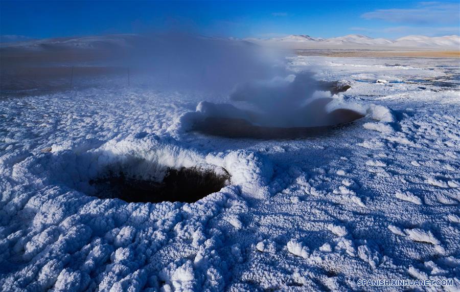 SHUANGHU, febrero 27, 2019 (Xinhua) -- Imagen del 1 de febrero de 2019 de una vista de un manantial de agua caliente, en el condado de Shuanghu, en la Región Autónoma del Tíbet, en el suroeste de China. El condado de Shuanghu, localizado a 5,000 metros sobre el nivel del mar en la Región Autónoma del Tíbet, en el suroeste de China, sufre de fuertes vientos 200 días al a?o. Con una temperatura media durante el a?o de menos cinco grados centígrados, Shuanghu es el hogar del tercer glaciar más grande del mundo, Purog Kangri. Ocasionalmente, la temperatura aquí cae a menos 40 grados centígrados. El condado, con un área de aproximadamente 120,000 kilómetros cuadrados, se encuentra en el medio de la Reserva Natural Nacional Qiangtang. Hay 135 empleados de conservación trabajando en las 15 estaciones de manejo y conservación de vida silvestre de Shuanghu para mejorar la protección de los animales salvajes. En 2018, el gobierno del condado suspendió la construcción de servicios de apoyo relacionados con el turismo alrededor del glaciar Purog Kangri para proteger mejor el medio ambiente. Shuanghu ahora tiene aproximadamente 20,000 yaks salvajes y 200,000 antílopes tibetanos, además de más de 20 especies raras como el leopardo de las nieves y el oso pardo. (Xinhua/Purbu Zhaxi)