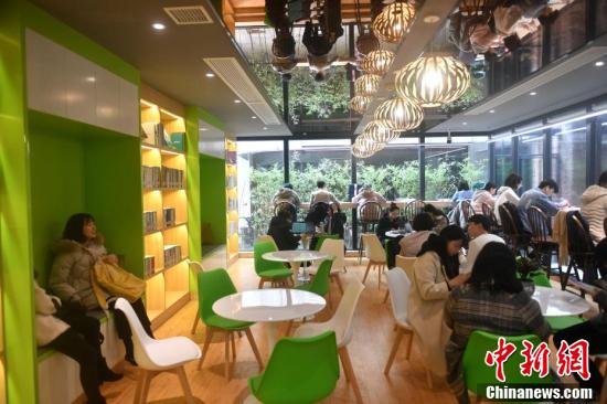 Los estudiantes se sientan alrededor de las mesas y estudian en el área de escritura del "estudio de 24 horas". [Foto / Chinanews.com]