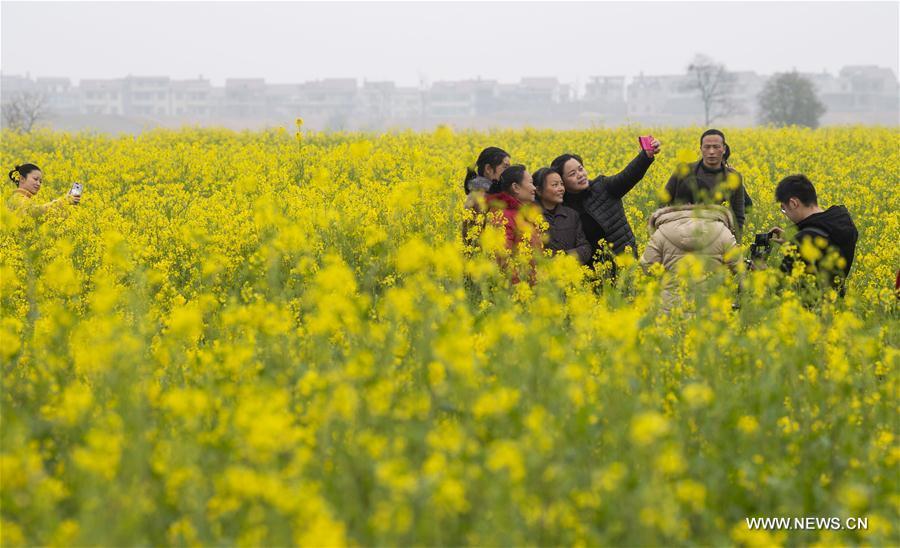 Los turistas se hacen fotos en un campo lleno de flores de colza en el pueblo autónomo de Longteng en el condado autónomo Mulao de Luocheng, región autónoma Zhuang de Guangxi, sur de China, el 26 de febrero de 2019. (Xinhua / Meng Zengshi)
