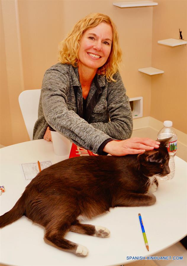 ALBUQUERQUE, febrero 28, 2019 (Xinhua) -- Imagen del 24 de febrero de 2019, de una clienta interactuando con gatos en el Café de Gatos Catopia, en Albuquerque, estado de Nuevo México, Estados Unidos. De acuerdo con información de la prensa local, los clientes del Café de Gatos Catopia, que abrió hace unos meses en Albuquerque, pueden pasar tanto tiempo como quieran con cerca de una docena de gatos mientras beben café y navegan por internet. Los cafés internet que tiene gatos en adopción son una nueva tendencia en el país hoy en día, con cerca de 100 de este tipo de establecimientos alrededor de Estados Unidos. (Xinhua/Richard Lakin)