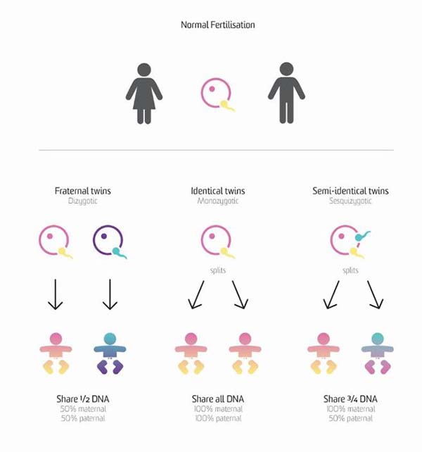 Cuando investigaron los cromosomas, los doctores encontraron que el ni?o y la ni?a eran idénticos por parte de su madre, pero compartían más o menos la mitad de su ADN paterno. En la literatura académica se les conoce como “gemelos sesquizygóticos” para diferenciarlos de los monozygóticos (idénticos) y los dizygóticos (fraternos).