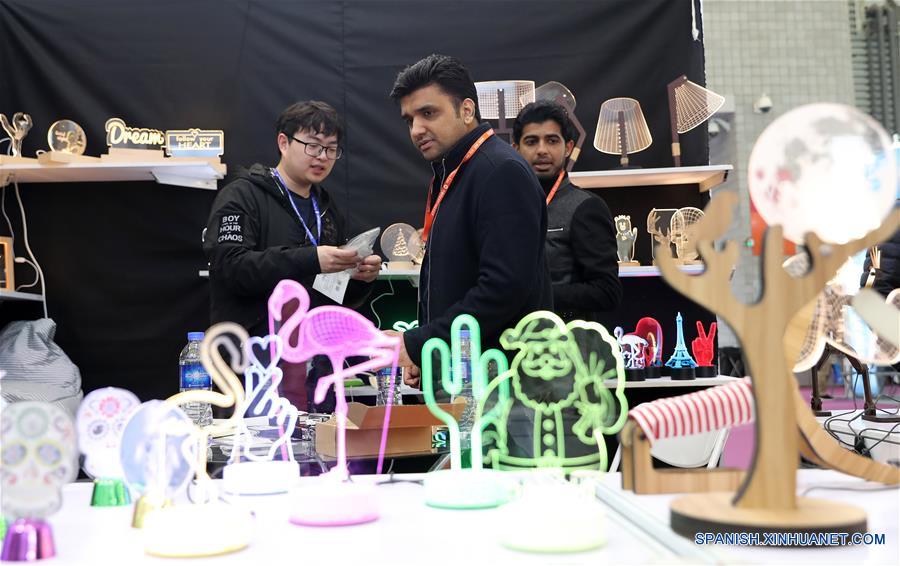 Comerciantes extranjeros visitan un estand de lámparas durante la 29 Feria del Este de China, en Shanghai, en el este China, el 1 de marzo de 2019. La feria comenzó el viernes en Shanghai. (Xinhua/Fang Zhe)