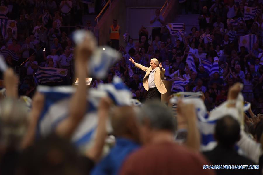 El presidente de Uruguay, Tabaré Vázquez saluda al finalizar su discurso sobre la rendición de cuentas anual, en el Antel Arena, en Montevideo, capital de Uruguay, el 1 de marzo de 2019. El presidente de Uruguay, Tabaré Vázquez, pidió el viernes al sistema político que la campa?a electoral para las elecciones presidenciales que elegirán a su sucesor sea "respetuosa" y "tolerante". Así lo dijo la noche del viernes en el acto por el cuarto aniversario de su mandato, el tercero consecutivo del izquierdista Frente Amplio (FA), celebrado en el estadio Antel Arena en Montevideo. (Xinhua/Nicolás Celaya)