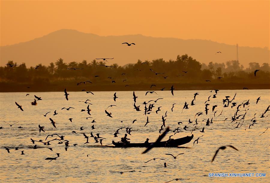 Gaviotas vuelan sobre la orilla del río Thanlwin durante la puesta de sol, en el municipio de Mawlamyine, estado de Mon, Myanmar, el 1 de marzo de 2019. (Xinhua/U Aung)