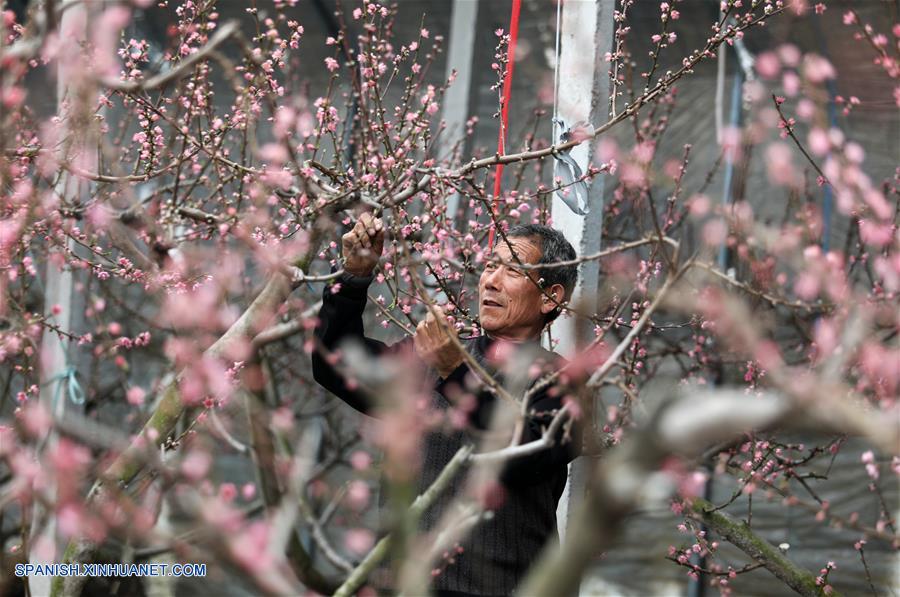 SHANDONG, marzo 2, 2019 (Xinhua) -- Imagen del 1 de marzo de 2019 de un agricultor trabajando en un invernadero duraznero, en la villa de Shili del condado de Tancheng en Linyi, provincia de Shandong, en el este de China. (Xinhua/Zhang Chunlei)
