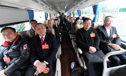 En la ma?ana del 27 de febrero de 2019, durante las Dos Sesiones del distrito Luqiao de Taizhou, provincia de Zhejiang, más del 90% de los representantes y miembros del comité viajaron enun autobús de nueva energía o caminaron hasta el lugar de celebración de las Dos Sesiones. (Wang Baochu / Diario del Pueblo)