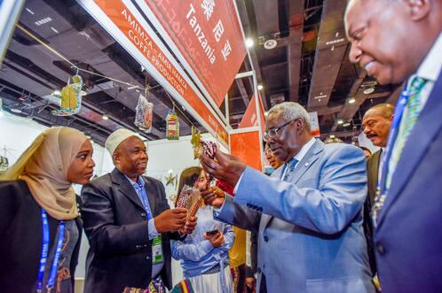Del 12 al 15 de septiembre de 2018, se celebraron la XV Exposición China-ASEAN y la Cumbre de Inversión y Negocios China-ASEAN en Nanning, Guangxi.El vicepresidente segundo de Zanzíbar, Tanzania,Seif Ali Iddi (primera fila, segundo a la derecha) visitó el Pabellón de Tanzania. (Foto: PengHuan / Diario del Pueblo)