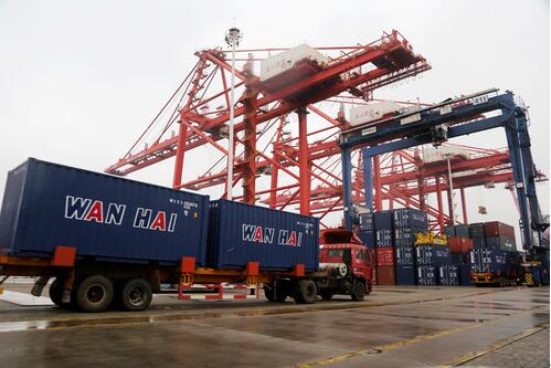 Los vehículos de transporte trasladan la carga importada que acaba de descargarse de los cargueros en elmuelle de contenedores del puerto de Lianyungang, en Jiangsu, el 14 de febrero de 2019. (Foto: Wang Chun / Diario del Pueblo)
