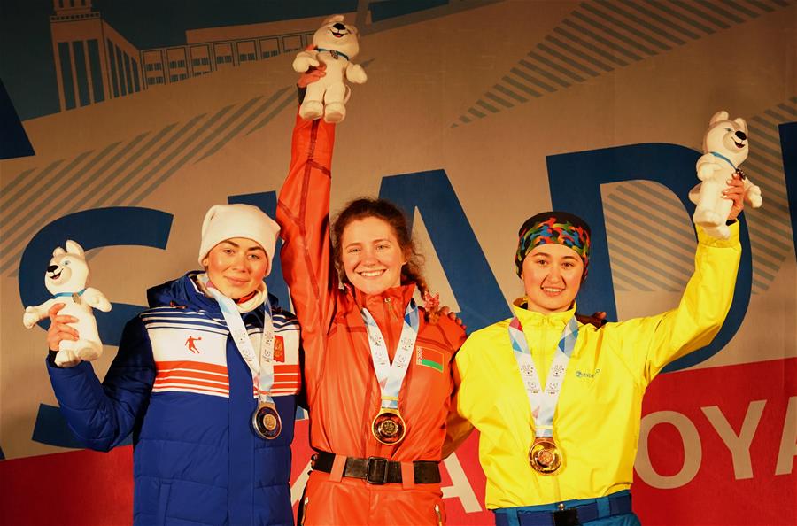 KRASNOYARSK, 3 marzo, 2019 (Xinhua) -- Aliaksandra Ramanouskaya (c), de Bielorrusia, Liubov Nikitina (i), de Rusia y Zhanbota Aldabergenova (d), de Kazajistán, posan durante la ceremonia de premiación de la final de esquí aéreo estilo libre femenil, en la 29 Universiada de Invierno en Krasnoyarsk, Rusia, el 3 de marzo de 2019. (Xinhua/Yang Shiyao)