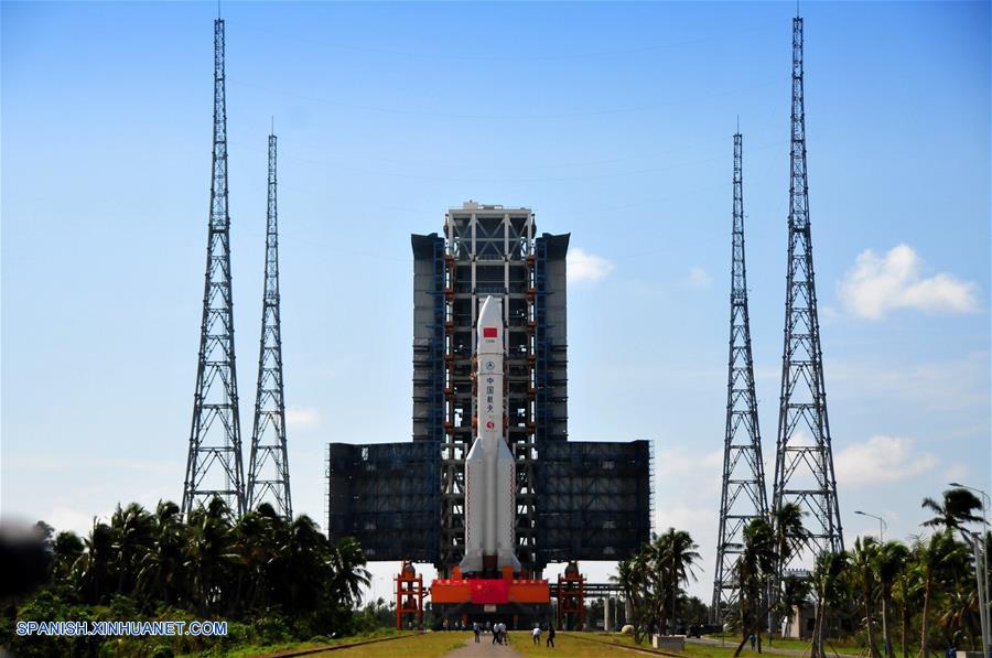 HAINAN, 4 marzo, 2019 (Xinhua) -- Imagen del 28 de octubre de 2016 del cohete portador Gran Marcha-5 recién desarrollado por China, preparándose para ser lanzado en el Centro de Lanzamiento Espacial de Wenchang, en la provincia de Hainan, en el sur de China. La Oficina de Ingeniería Espacial Tripulada de China anunció el lunes que el módulo central de la estación espacial del país, el cohete portador Gran Marcha-5B y sus cargas serán enviados al lugar de lanzamiento en el segundo semestre del a?o, con el fin de hacer preparativos para las misiones de la estación espacial. China tiene previsto completar la construcción de la estación espacial en torno a 2022. Será el laboratorio espacial del país con funcionamiento en órbita estable a largo plazo. (Xinhua/Sun Hao)