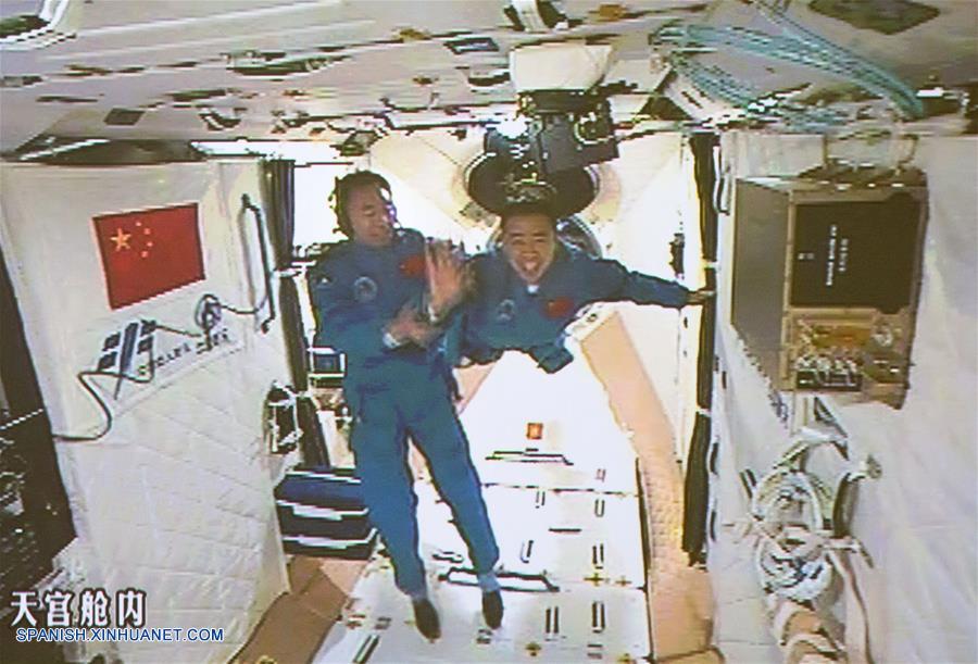 Imagen del 19 de octubre de 2016 de una transmisión de los dos astronautas chinos Jin Haipeng (i) y Chen Dong (d), entrando al laboratorio espacial Tiangong-2, en el Centro de Control Aeroespacial de Beijing, capital de China. La Oficina de Ingeniería Espacial Tripulada de China anunció el lunes que el módulo central de la estación espacial del país, el cohete portador Gran Marcha-5B y sus cargas serán enviados al lugar de lanzamiento en el segundo semestre del a?o, con el fin de hacer preparativos para las misiones de la estación espacial. China tiene previsto completar la construcción de la estación espacial en torno a 2022. Será el laboratorio espacial del país con funcionamiento en órbita estable a largo plazo. (Xinhua/Ju Zhenzhua)