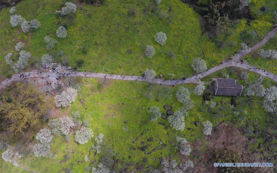 GUANGXI, 5 marzo, 2019 (Xinhua) -- Imagen del 3 de marzo de 2019 de una vista aérea de turistas saliendo y disfrutando del paisaje y de las flores en el pueblo Tongban del condado Rong'an, en la Región Autónoma Zhuang de Guangxi, en el sur de China. Tongban está situada en la remota y empobrecida región monta?osa. Long Gexiong, residente de Tongban, quien había estado fuera para hacer trabajo migrante durante 20 a?os, tomó la decisión de regresar a su ciudad natal para comenzar un negocio en 2019. El y algunos primos utilizaron sus ahorros para establecer una cooperativa de agricultores para la venta de fruta y el turismo rural. El gobierno local los apoyó fuertemente con la construcción de infraestructura. Después de varios a?os de desarrollo, la peque?a aldea había sufrido enormes cambios. Cada primavera, la flores de ciruelo y coles atrajeron a muchos turistas de todo el país. Hoy, la aldea rural anteriormente pobre se ha convertido en una famosa aldea ejemplar en Guangxi. (Xinhua/Huang Xiaobang)