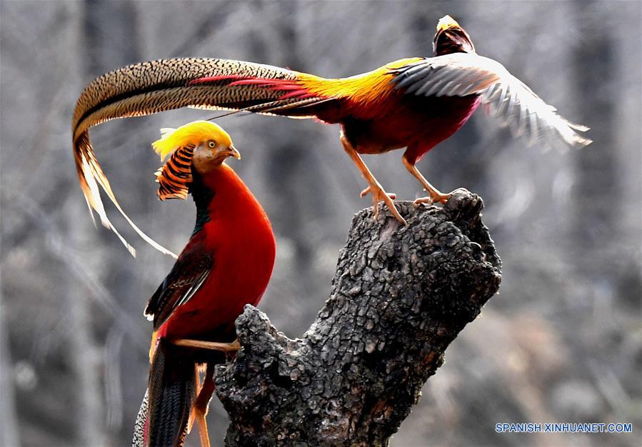 HENAN, 5 marzo, 2019 (Xinhua) -- Dos faisanes dorados reaccionan en el bosque de la aldea Mengcun en el condado Ruyang, de la provincia de Henan, en el centro de China, el 5 de marzo de 2019. (Xinhua/Li An)