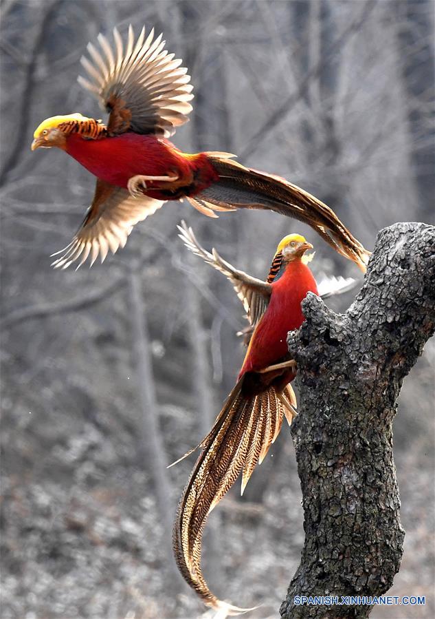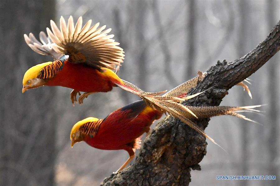 HENAN, 5 marzo, 2019 (Xinhua) -- Dos faisanes dorados vuelan en el bosque de la aldea Mengcun en el condado Ruyang, de la provincia de Henan, en el centro de China, el 5 de marzo de 2019. (Xinhua/Li An)