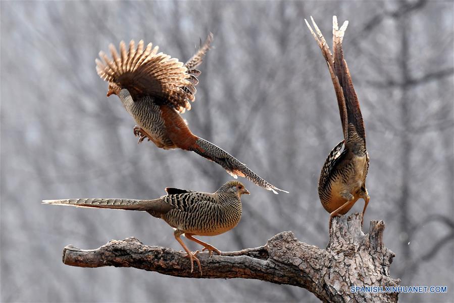 HENAN, 5 marzo, 2019 (Xinhua) -- Tres faisanes dorados reaccionan en el bosque de la aldea Mengcun en el condado Ruyang, de la provincia de Henan, en el centro de China, el 5 de marzo de 2019. (Xinhua/Li An)