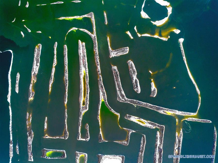 SHANXI, 6 marzo, 2019 (Xinhua) -- Imagen del 5 de marzo de 2019 de una vista aérea del paisaje de primavera del lago salado Yuncheng, en Yuncheng, provincia de Shanxi, en el norte de China. (Xinhua/Xue Jun)