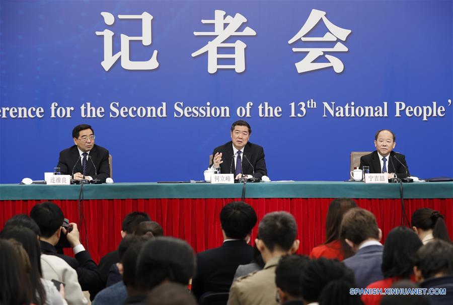 He Lifeng, director de la Comisión Nacional de Desarrollo y Reforma, responde preguntas durante una conferencia de prensa sobre el impulso del desarrollo de alta calidad de la economía china en el marco de la segunda sesión de la XIII Asamblea Popular Nacional en Beijing, capital de China, el 6 de marzo de 2019.(Xinhua/Zhai Jianlan)